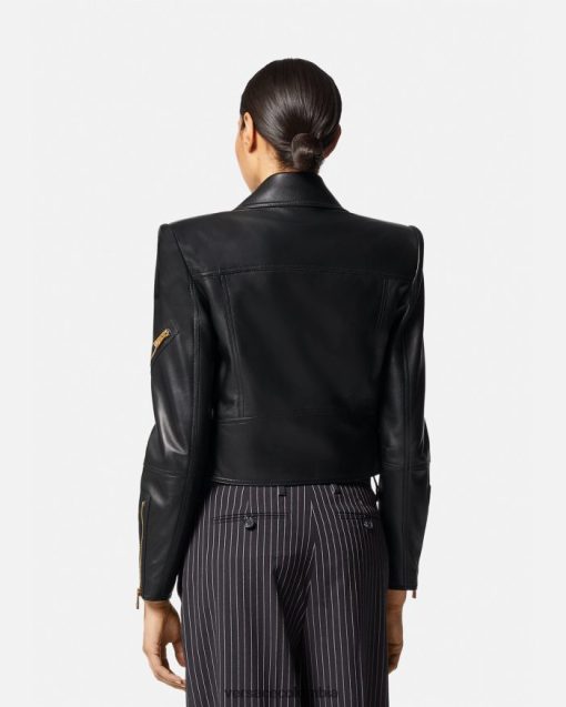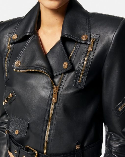 Confeccionada íntegramente en cuero con un acabado de grano suave, esta chaqueta corta de inspiración motera tiene una cremallera diagonal, cinturón en la cintura y está realzada con detalles metálicos de Medusa y bolsillos decorativos con cremallera.