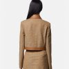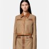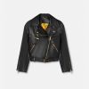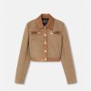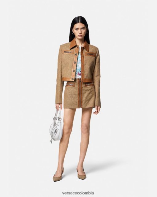 Esta chaqueta corta de lona y cuero presenta el estampado integral de Versace y detalles metálicos de Medusa.