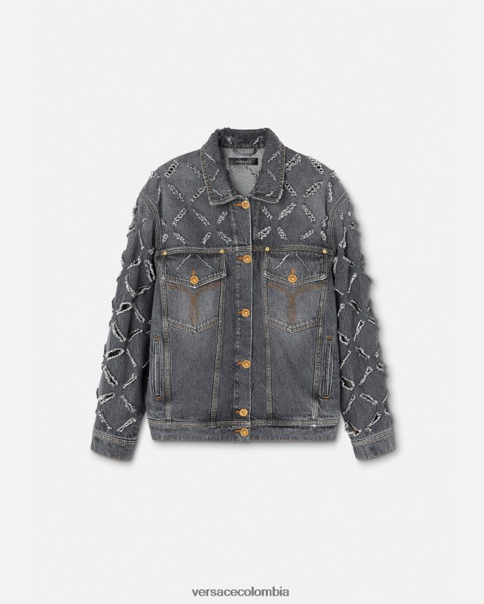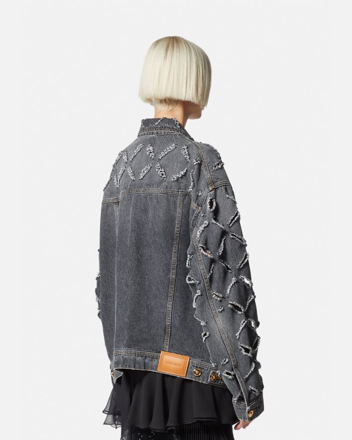 Confeccionada con mezclilla con un acabado lavado, esta chaqueta de gran tamaño presenta cortes de diamantes desgastados cortados con láser en toda su extensión para una apariencia de inspiración grunge. Los botones de Medusa acentúan la pieza.