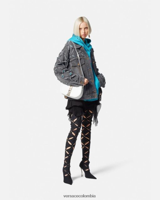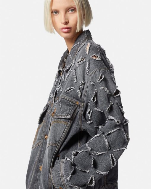 Confeccionada con mezclilla con un acabado lavado, esta chaqueta de gran tamaño presenta cortes de diamantes desgastados cortados con láser en toda su extensión para una apariencia de inspiración grunge. Los botones de Medusa acentúan la pieza.