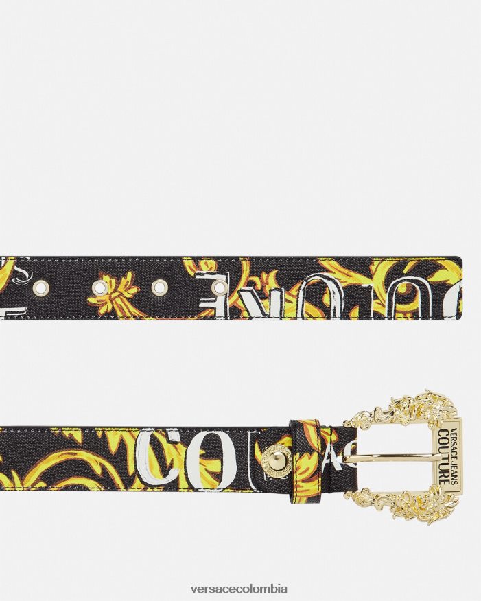 un cinturón forrado de cuero con hebilla barroca y logotipo de alta costura estampado por toda la prenda.