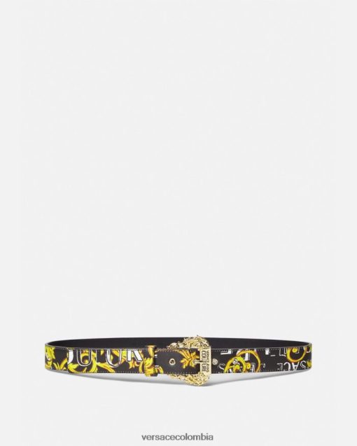 un cinturón forrado de cuero con hebilla barroca y logotipo de alta costura estampado por toda la prenda.