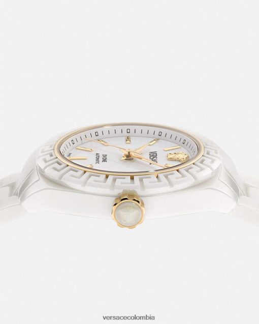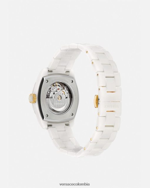 Este reloj automático de cerámica está lleno de detalles, incluida la greca en el anillo superior y la medusa a las 12 en punto. En la esfera aparece una inscripción “dv one”. El accesorio se completa con una banda de cerámica. Todos los relojes Versace están garantizados por la marca “fabricación suiza”.