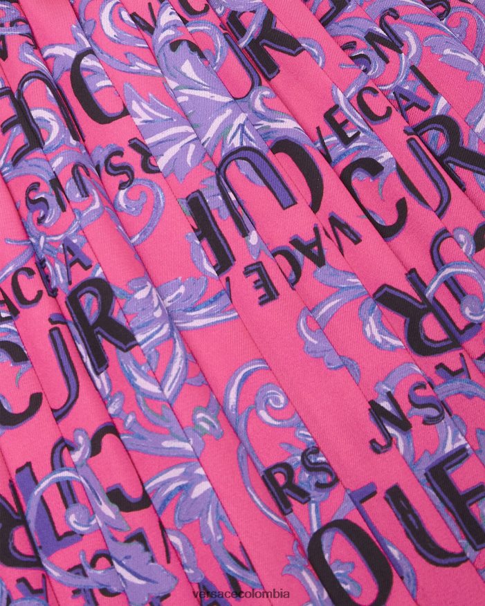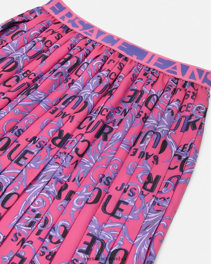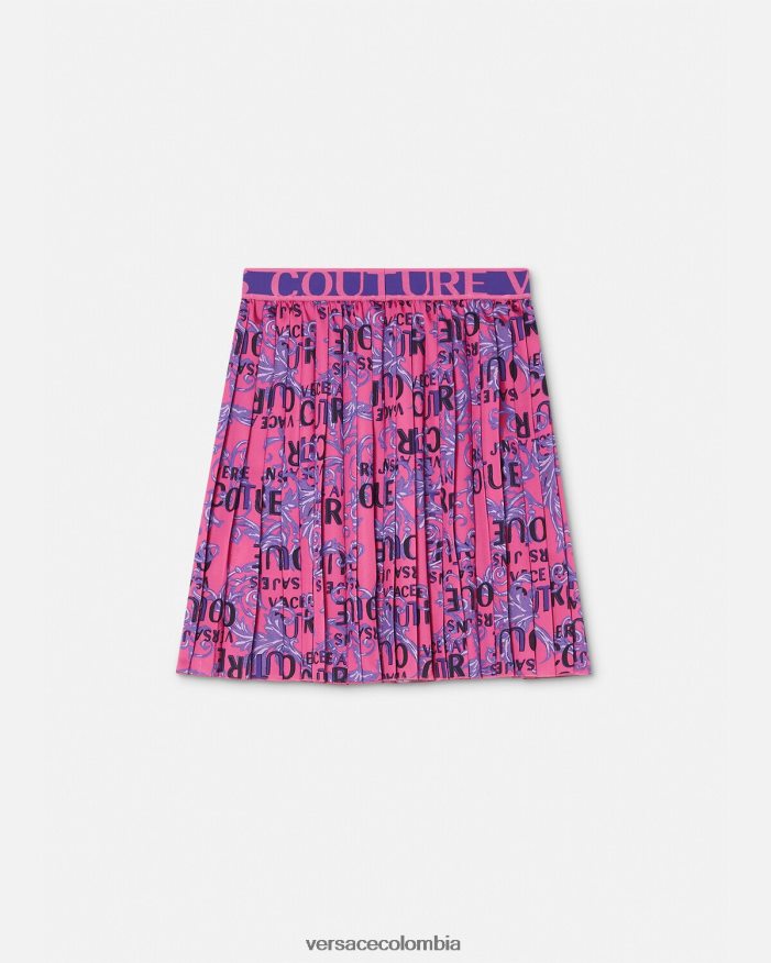 una falda fluida plisada con logo en la cinturilla y estampado de alta costura con logo en toda la prenda.