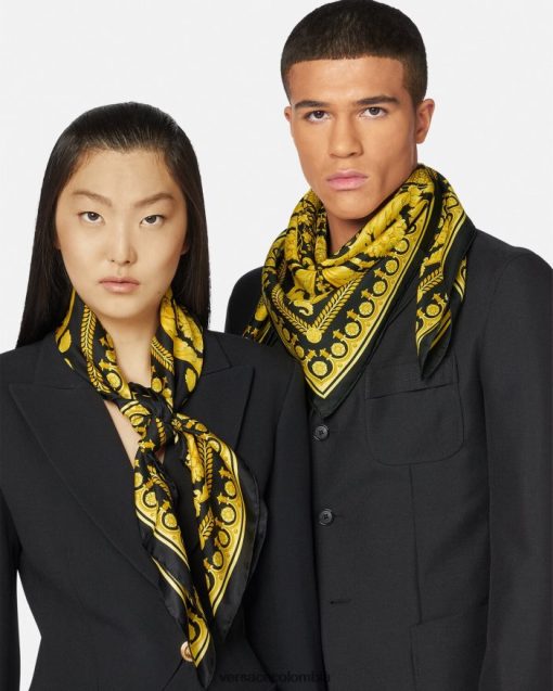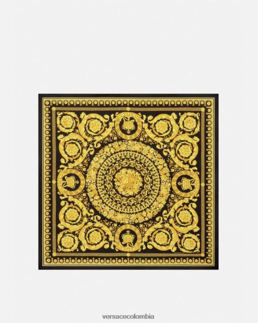 Este fular, confeccionado en pura seda, presenta el característico estampado barroco. Introducido por primera vez por Gianni Versace a principios de los años 90, el estampado yuxtapone hojas de acanto estilizadas con un fondo sólido.