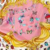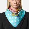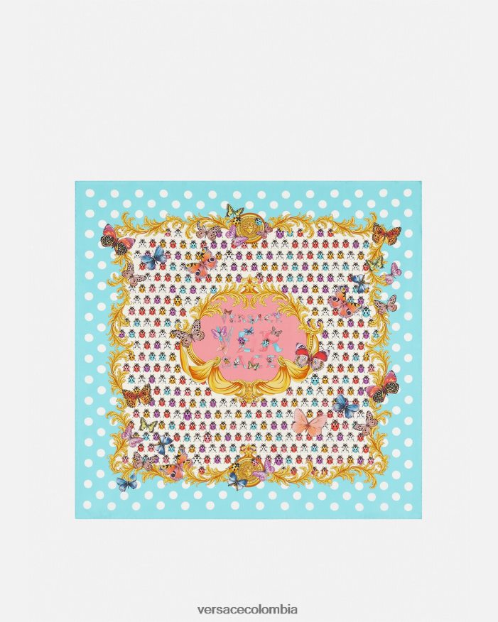Este pañuelo de seda presenta un patrón de archivo renovado de los años 90 que presenta mariposas y mariquitas sobre un fondo brillante con lunares y adornos barrocos.