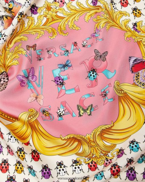Este pañuelo de seda presenta un patrón de archivo renovado de los años 90 que presenta mariposas y mariquitas sobre un fondo brillante con lunares y adornos barrocos.