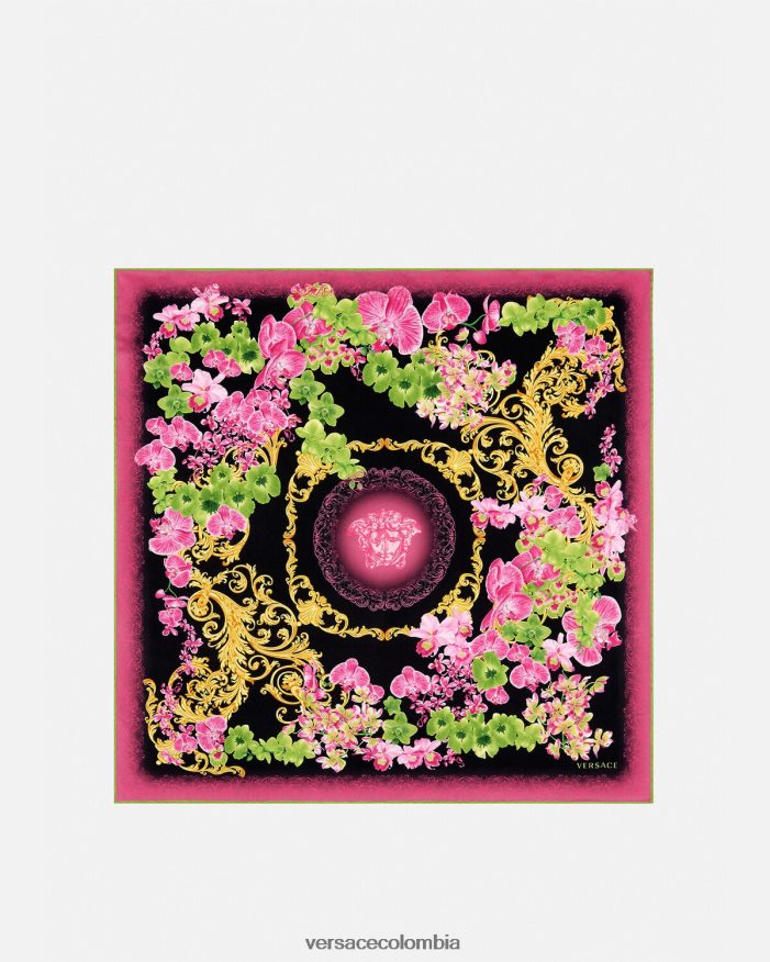 Confeccionado en pura seda, este fular cuadrado grande presenta el estampado de orquídeas medusa, el emblema característico de Versace, rodeado de motivos florales.