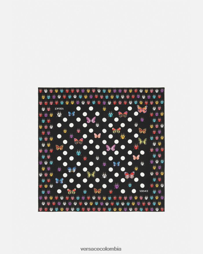 un fular de sarga de pura seda con bordes enrollados a mano y un estampado de archivo reinventado de lunares con motivos de mariposas y mariquitas. Este artículo forma parte de la colección cápsula codiseñada con Dua Lipa.