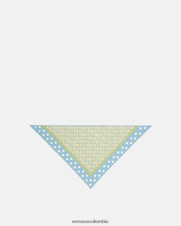 Este fular está confeccionado en pura seda y presenta el estampado integral de Versace, con letras delineadas y un fondo de lunares.