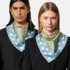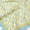 Este fular está confeccionado en pura seda y presenta el estampado integral de Versace, con letras delineadas y un fondo de lunares.