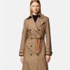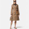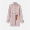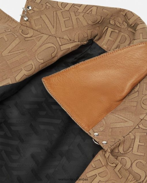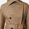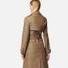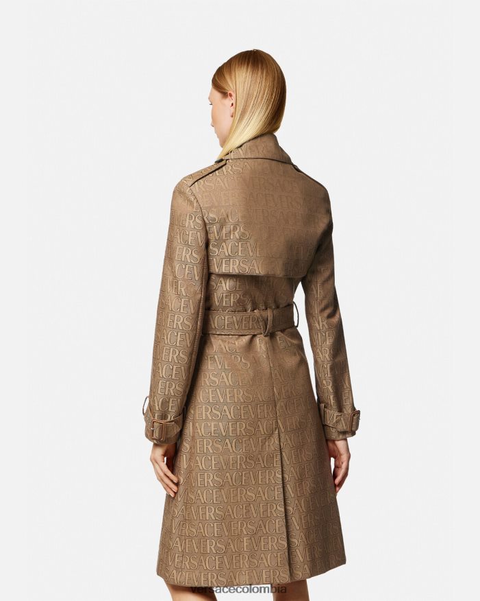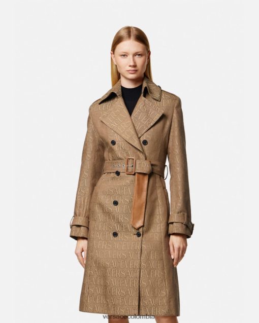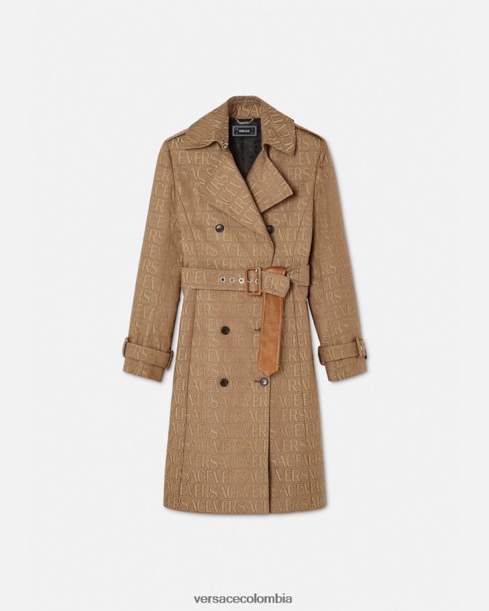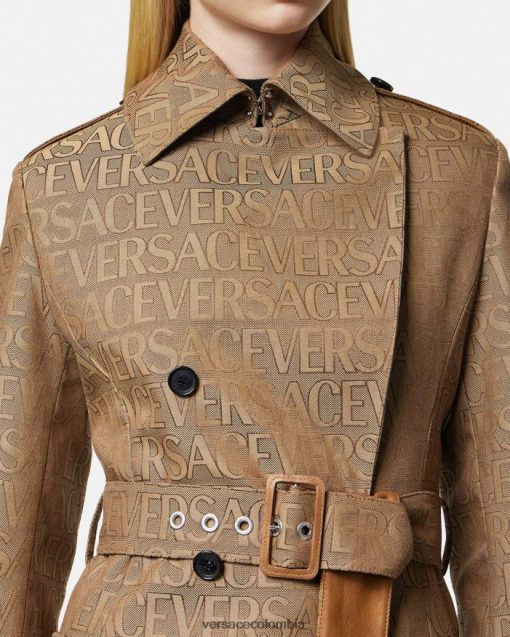 una gabardina de lona de Versace con estampado integral de jacquard que presenta un cinturón y cuello reversibles ribeteados en cuero y un cierre cruzado.