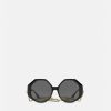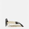 Caracterizadas por relucientes patillas con Greca, estas atrevidas gafas de sol se vieron en la pasarela. El llamativo diseño presenta una gruesa montura negra y lentes de color gris oscuro, que canalizan el glamour icónico de Versace. Las gafas de sol vienen con una cadena desmontable adornada con greca.