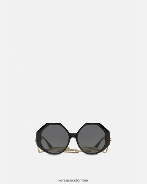 Caracterizadas por relucientes patillas con Greca, estas atrevidas gafas de sol se vieron en la pasarela. El llamativo diseño presenta una gruesa montura negra y lentes de color gris oscuro, que canalizan el glamour icónico de Versace. Las gafas de sol vienen con una cadena desmontable adornada con greca.
