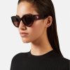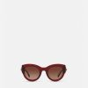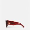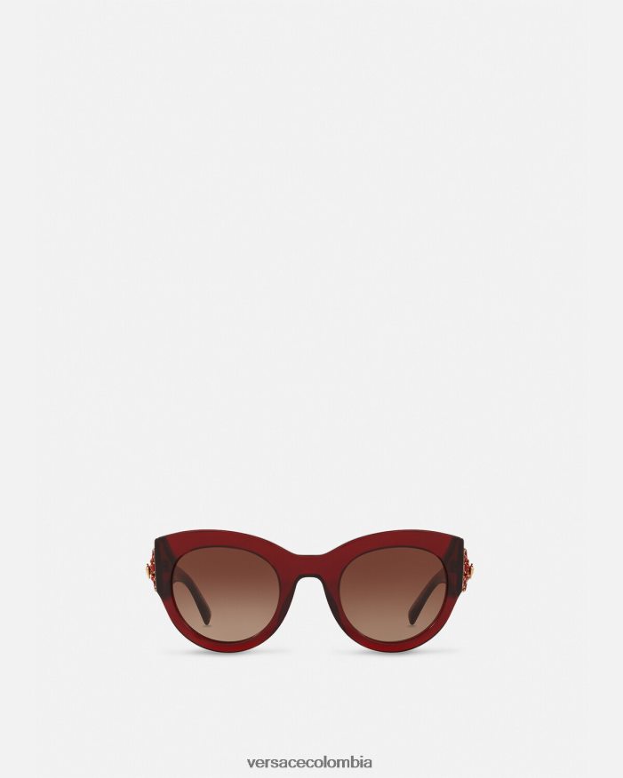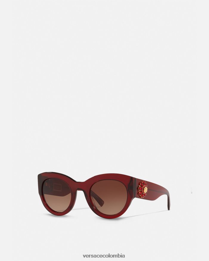 Estas gafas de sol tributo se actualizan con un nuevo detalle en las patillas: caracterizado por un pequeño icono de medusa rodeado de pétalos de cristal. Las gafas de sol cuentan con una montura y lentes transparentes de color burdeos.