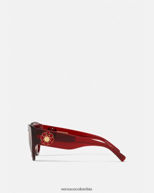 Estas gafas de sol tributo se actualizan con un nuevo detalle en las patillas: caracterizado por un pequeño icono de medusa rodeado de pétalos de cristal. Las gafas de sol cuentan con una montura y lentes transparentes de color burdeos.