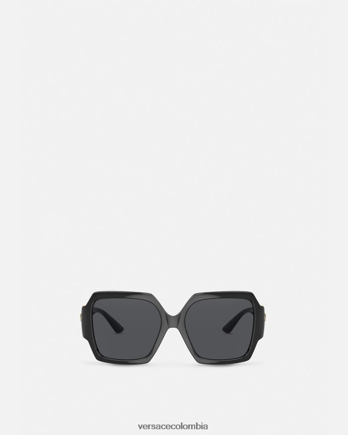 Gafas de sol geométricas de carey con un emblema de medusa en el lateral.