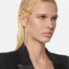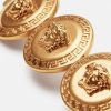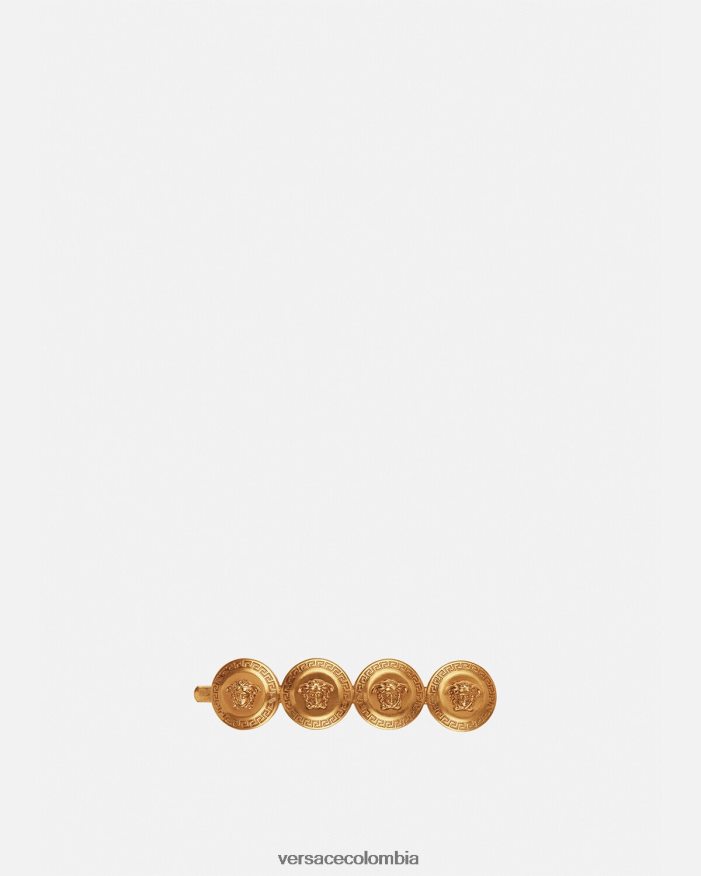 El pasador dorado de Versace del desfile de moda tributo para mujer primavera verano 2018 presenta un clip deslizante con cuatro medallones de medusa. esta pieza tiene una calidad de color con efecto vintage. Ninguno de los productos de joyería de Versace contiene plomo ni níquel. Todos los materiales son hipoalergénicos.
