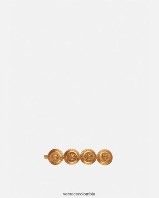 El pasador dorado de Versace del desfile de moda tributo para mujer primavera verano 2018 presenta un clip deslizante con cuatro medallones de medusa. esta pieza tiene una calidad de color con efecto vintage. Ninguno de los productos de joyería de Versace contiene plomo ni níquel. Todos los materiales son hipoalergénicos.