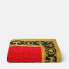 una lujosa toalla de playa de felpa de algodón suave que presenta un motivo tonal de versace en toda la prenda con bordes en contraste con estampado barroco.
