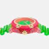 - pulsera: correa transparente de pu verde lima con trabilla de metal con greca a las 6 h y hebilla con lengüeta
