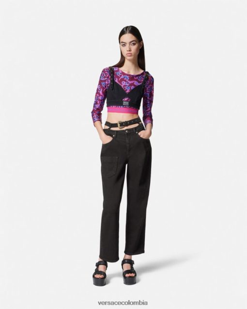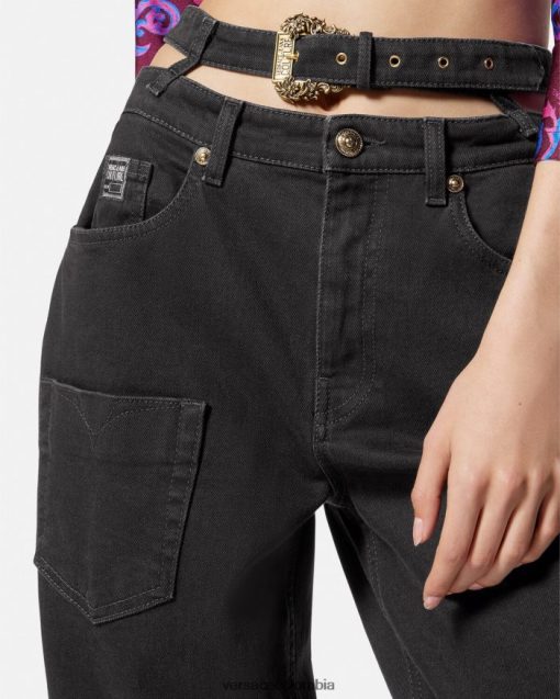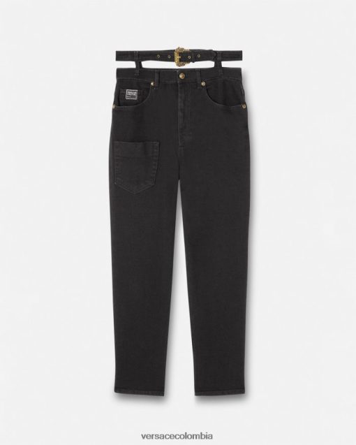 Estos jeans ajustados presentan un diseño de cinco bolsillos con un cinturón con hebilla barroca recortada en la cintura.