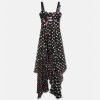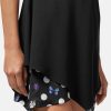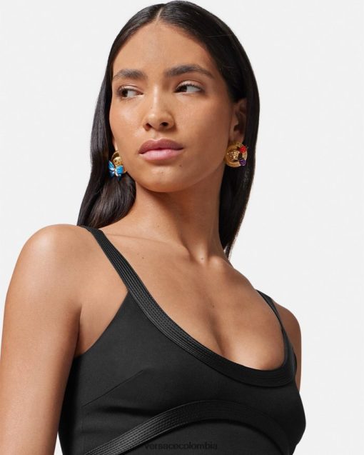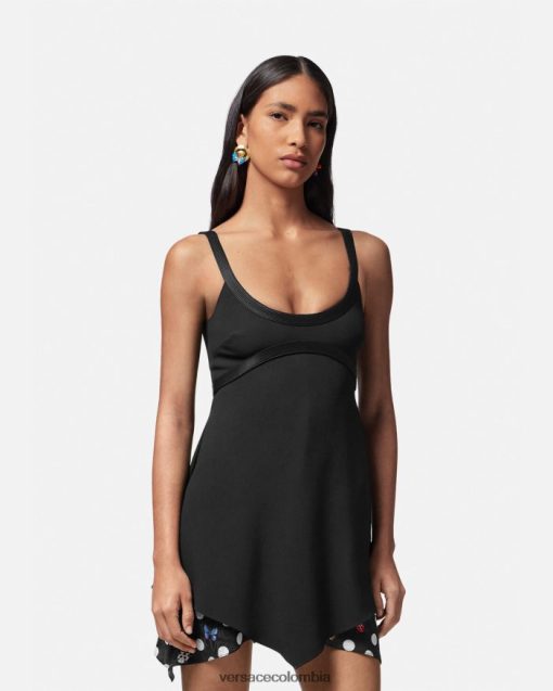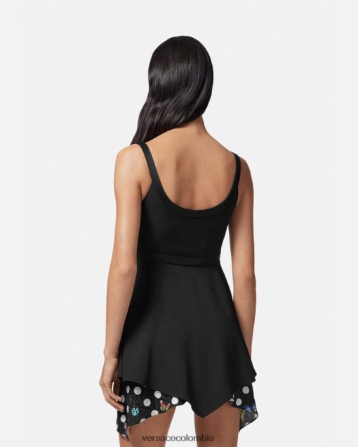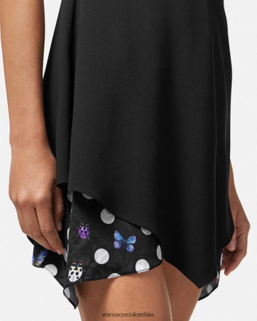 versace presenta dua lipa x versace, una colección cápsula codiseñada con dua lipa. Este minivestido acampanado presenta ribetes de satén ‘nastro gianni’ con costuras superiores y paneles fluidos con lunares en capas de mariposas y mariquitas con un estampado integral tonal de Versace.