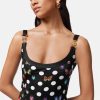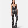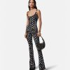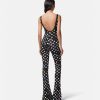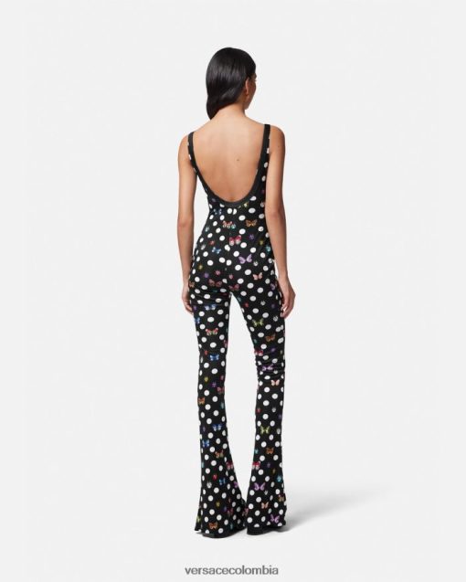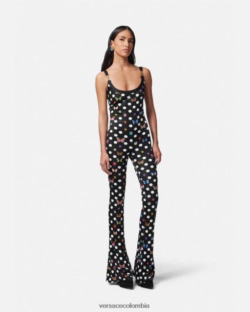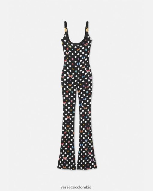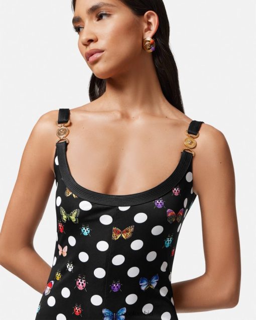 versace presenta dua lipa x versace, una colección cápsula codiseñada con dua lipa. Este mono fluido de punto sin mangas presenta un estampado de lunares con motivos de mariposas y mariquitas, detallado con ribetes de satén ‘nastro gianni’ y detalles metálicos de Medusa ’95 en los tirantes.