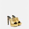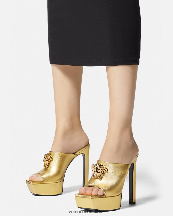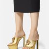 Estas mules con plataforma están confeccionadas en cuero con un acabado metálico. Tienen tacones altos de aguja con una placa de medusa en la parte delantera.