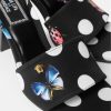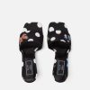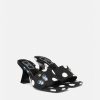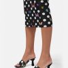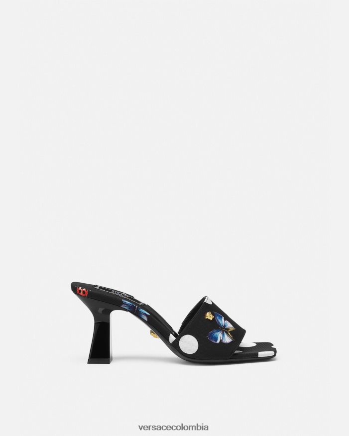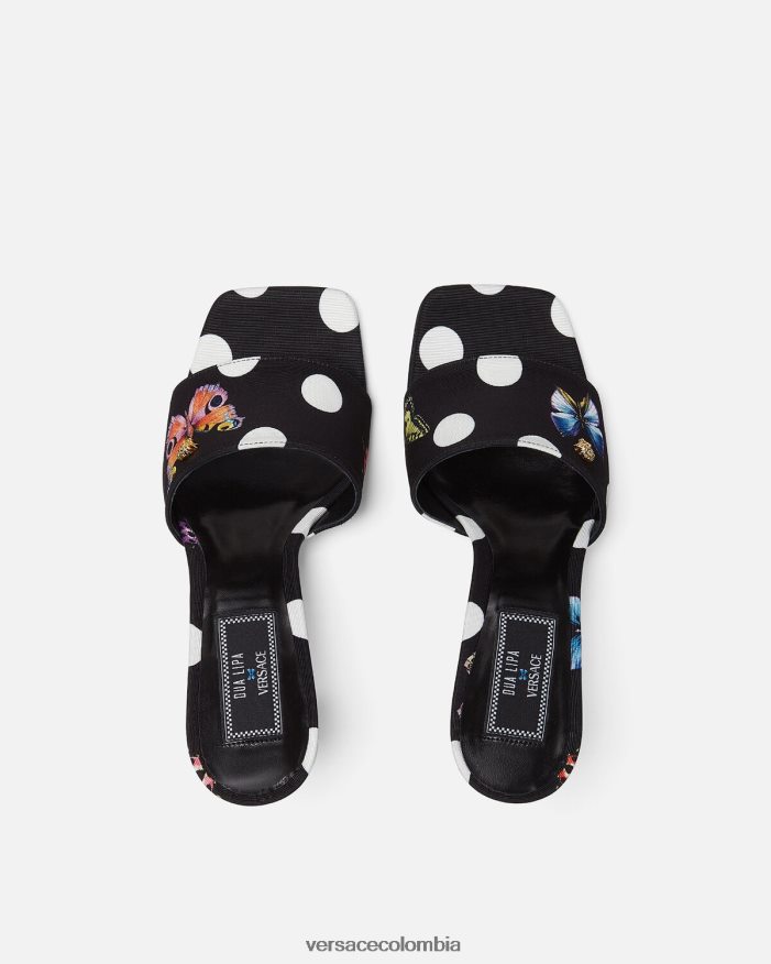 versace presenta dua lipa x versace, una colección cápsula codiseñada con dua lipa. Estas mules de lona con lunares presentan un estampado de mariposas y mariquitas y tienen un tacón medio bloque brillante, acentuado con piezas metálicas de medusa.