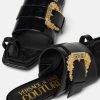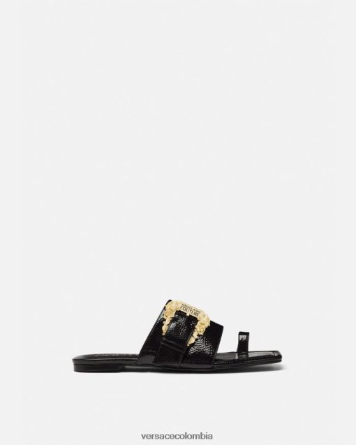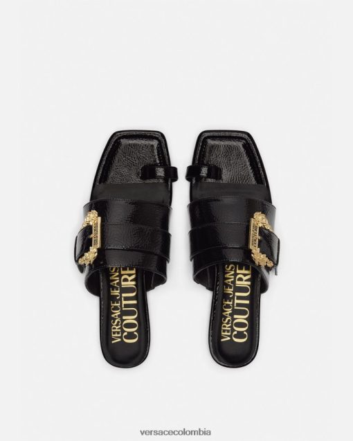 Estas mules planas de charol cuentan con una sola correa en la puntera y están acentuadas por la hebilla barroca.
