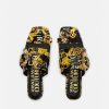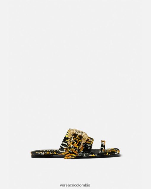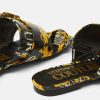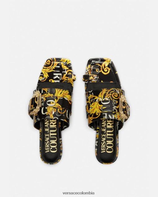 Estas mules planas de charol cuentan con una sola correa en la puntera, un estampado de alta costura con el logotipo en toda la prenda y están acentuadas por la hebilla barroca.