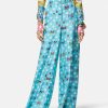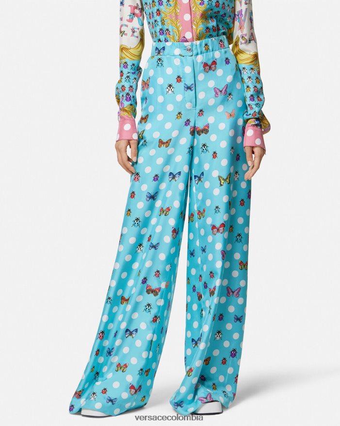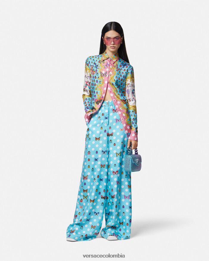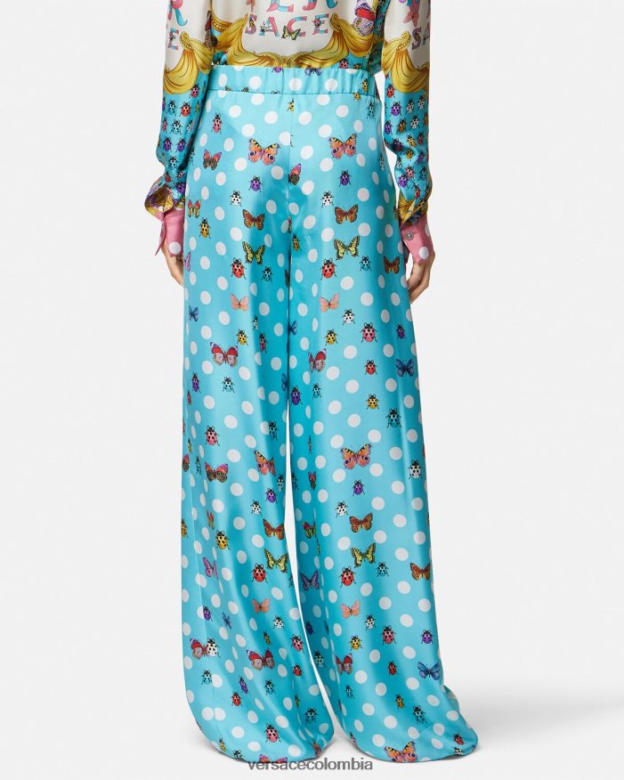Estos pantalones de sarga de seda tienen un diseño inspirado en la ropa de estar por casa con una tapeta con botones ocultos y presentan el estampado de mariposas y mariquitas de archivo.