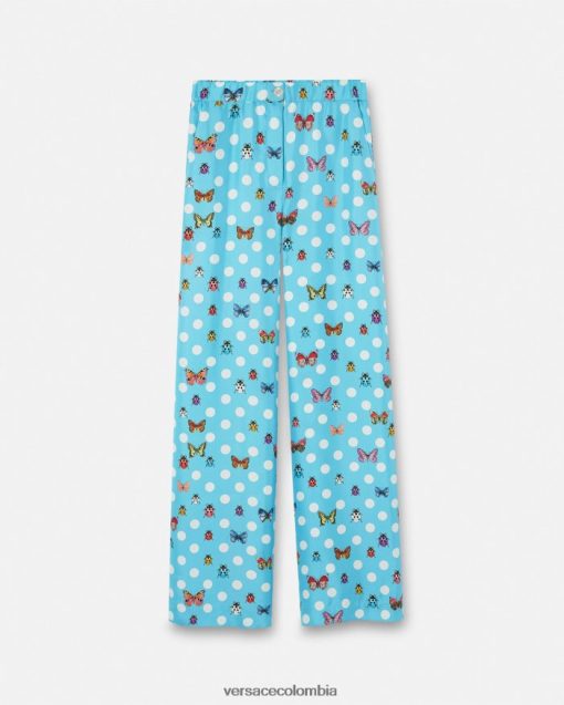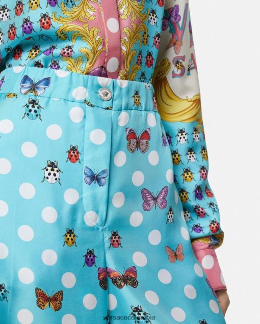 Estos pantalones de sarga de seda tienen un diseño inspirado en la ropa de estar por casa con una tapeta con botones ocultos y presentan el estampado de mariposas y mariquitas de archivo.