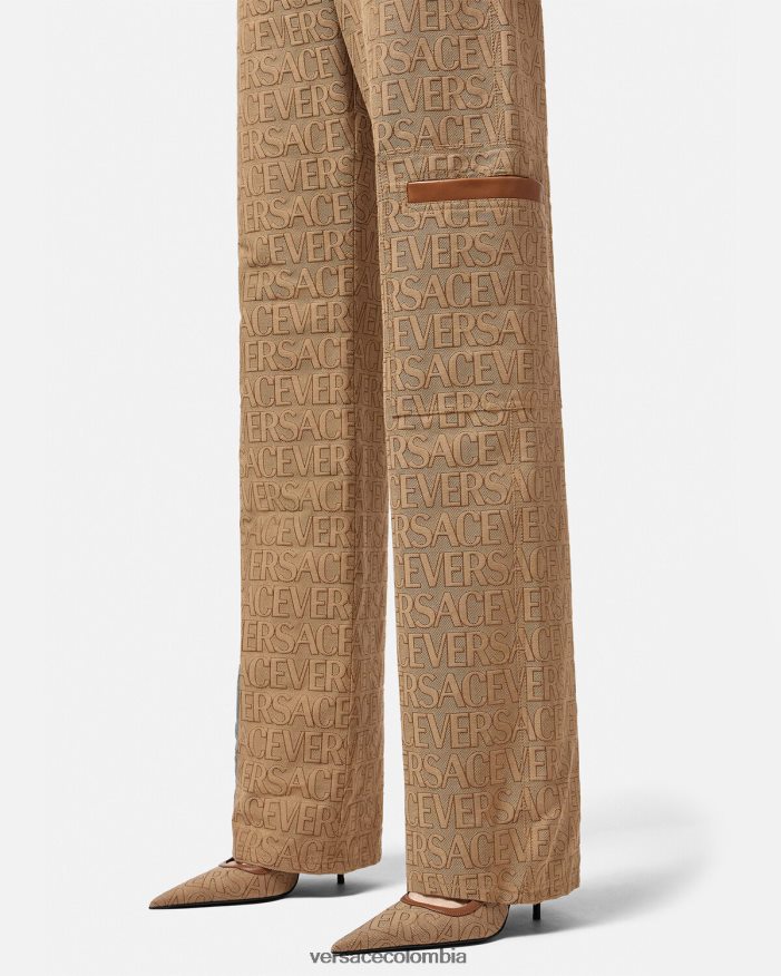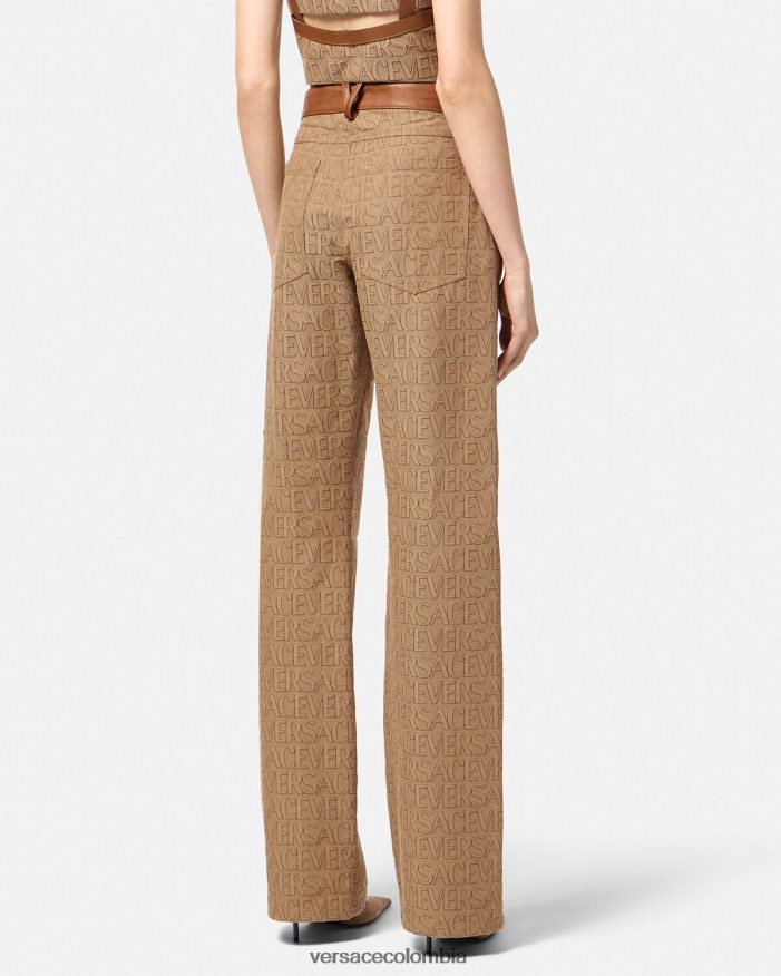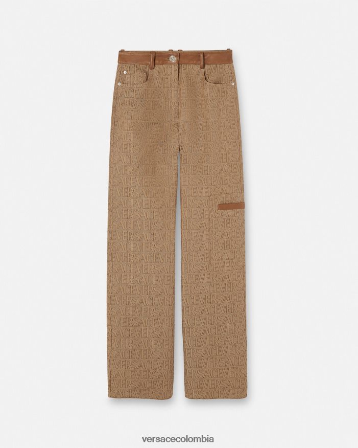 Estos pantalones de pierna recta presentan un diseño de cinco bolsillos, ribetes de cuero y un patrón jacquard integral de Versace.