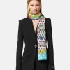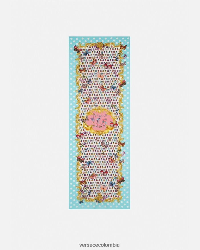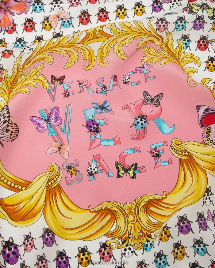 Esta bufanda de seda presenta un estampado de archivo renovado de los años 90 con mariposas y mariquitas sobre un fondo de lunares y adornos barrocos.