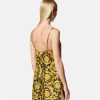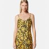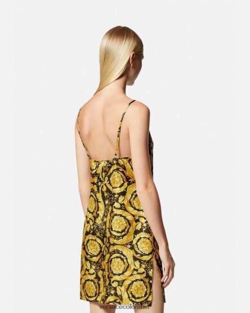 Este vestido tipo pijama, confeccionado en sarga de seda, presenta un estampado barroco por toda la prenda.