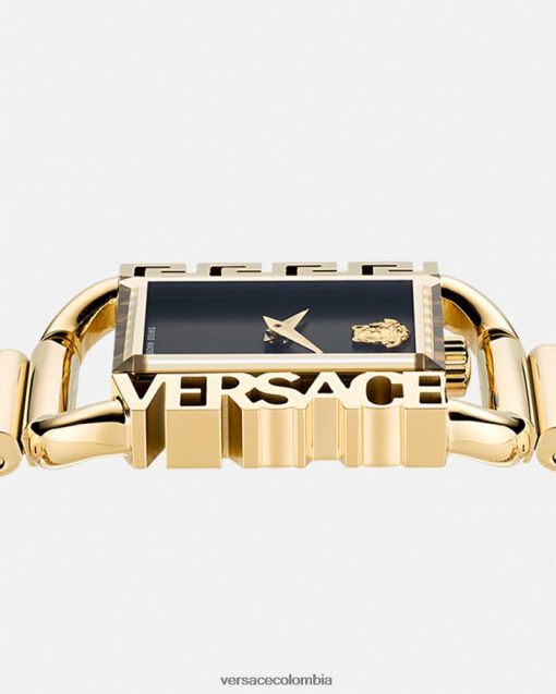 un reloj elegante caracterizado por una caja rectangular con una greca calada y letras de Versace que enmarcan la esfera. El reloj femenino presenta una medusa a las 12 en punto y un sistema de movimiento de dos manecillas. una banda de metal con cierre de mariposa y pulsadores completa el accesorio.