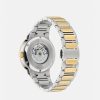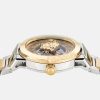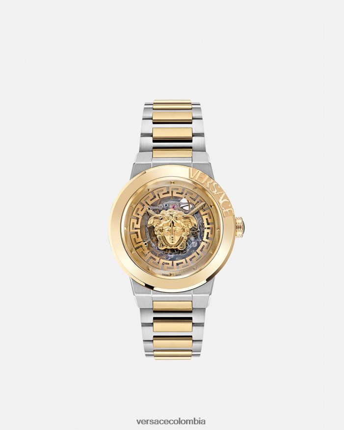 Este elegante reloj, de edición limitada, presenta una esfera esqueletizada con una medusa tridimensional engastada entre dos cristales y un sistema de movimiento de dos manecillas. un patrón de greca de metal aparece en la esfera interior, mientras que una letra de Versace grabada en el anillo enmarca la caja. El accesorio está acabado con una banda de metal.