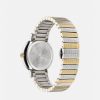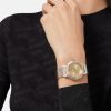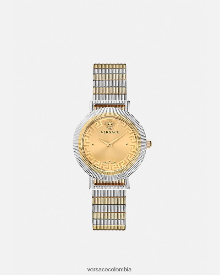 un reloj con movimiento de dos agujas que recuerda los códigos de la marca con su emblema de medusa tridimensional a las 12 en punto y un patrón de greca de metal en el anillo interior. La banda de metal está detallada con eslabones horizontales grabados.