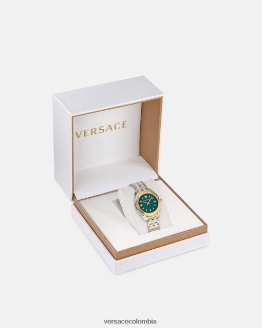 Este reloj moderno se caracteriza por un anillo grabado con las letras Versace. la esfera presenta un patrón de greca tonal, un logotipo en contraste y un emblema de medusa tridimensional. La banda de metal presenta eslabones centrales con Greca grabada y está rematada con un cierre de hebilla de mariposa y pulsadores. Todos los relojes Versace están garantizados por la marca “fabricación suiza”.