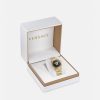 Este elegante reloj presenta una medusa tridimensional engastada entre dos cristales con un sistema de movimiento de dos manecillas. un patrón de asa de greca aparece en la esfera interior, mientras que una letra de Versace grabada en el anillo enmarca la caja. El accesorio está acabado con una banda de metal.