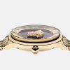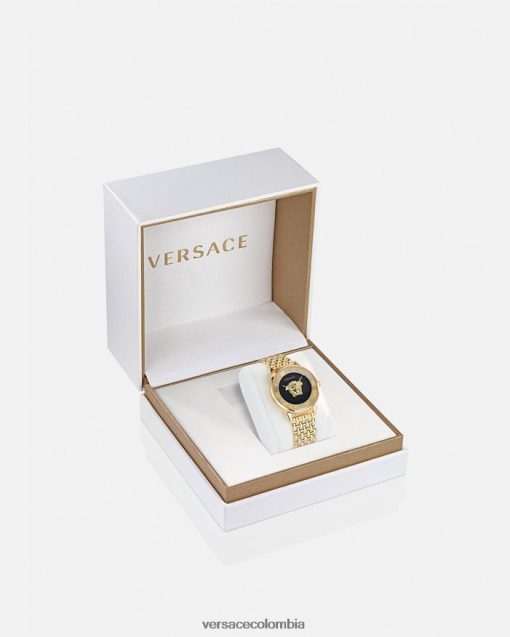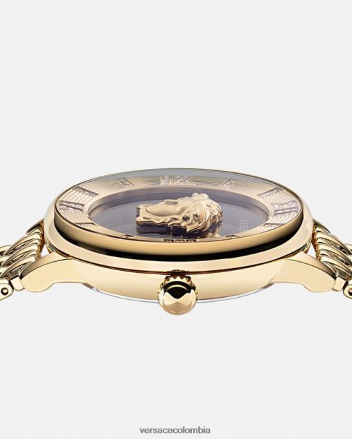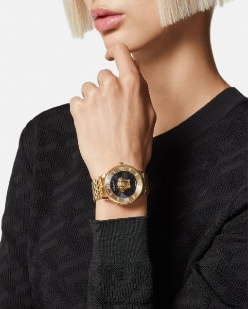 Este reloj, elegante e impactante, presenta una medusa tridimensional engastada entre dos cristales e índices de números romanos adornados con 60 diamantes de 0,33 quilates. El reloj La Medusa se completa con una correa de metal.