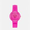 un reloj moderno en ricos colores pop detallados con símbolos tonales de Versace que incluyen una medusa tridimensional, un anillo interior de greca y letras de Versace en la banda de silicona. El accesorio se entrega en una bolsita de silicona a juego. Todos los relojes Versace están garantizados por la marca “fabricación suiza”.