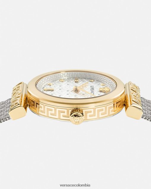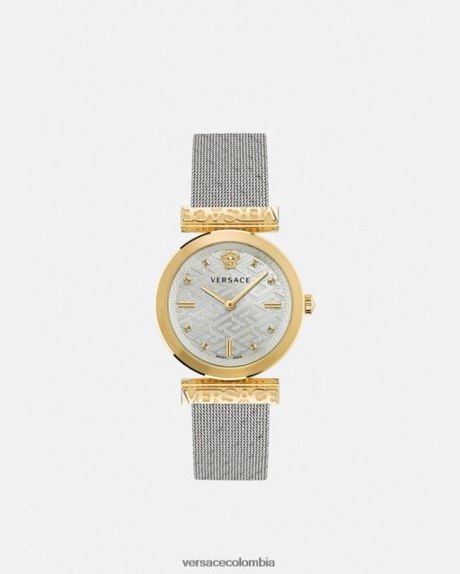 Este refinado reloj se caracteriza por las letras Versace en las asas que enmarcan la esfera. La esfera está enriquecida con una medusa tridimensional a las 12 h y un patrón de greca. El accesorio se completa con una banda de malla metálica. Todos los relojes Versace están garantizados por la marca “fabricación suiza”.