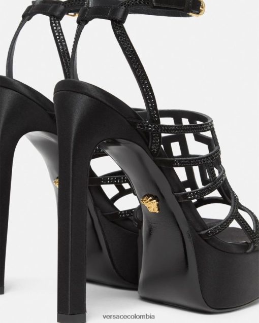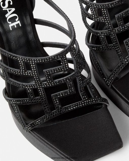 Estas sandalias de satén, con tacones de aguja altos, tienen una silueta con la puntera abierta y una tira en el tobillo. Las plataformas presentan un patrón de greca calado adornado con cristales en la correa delantera en un distintivo diseño de laberinto.