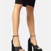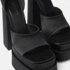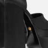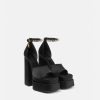 Un diseño muy versace, estas sandalias de satén cuentan con una puntera cuadrada abierta con un tacón alto en bloque y una plataforma doble. la correa del tobillo está adornada con cristales y un dije de medusa característico.