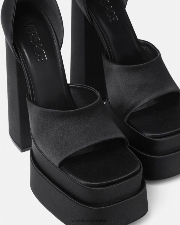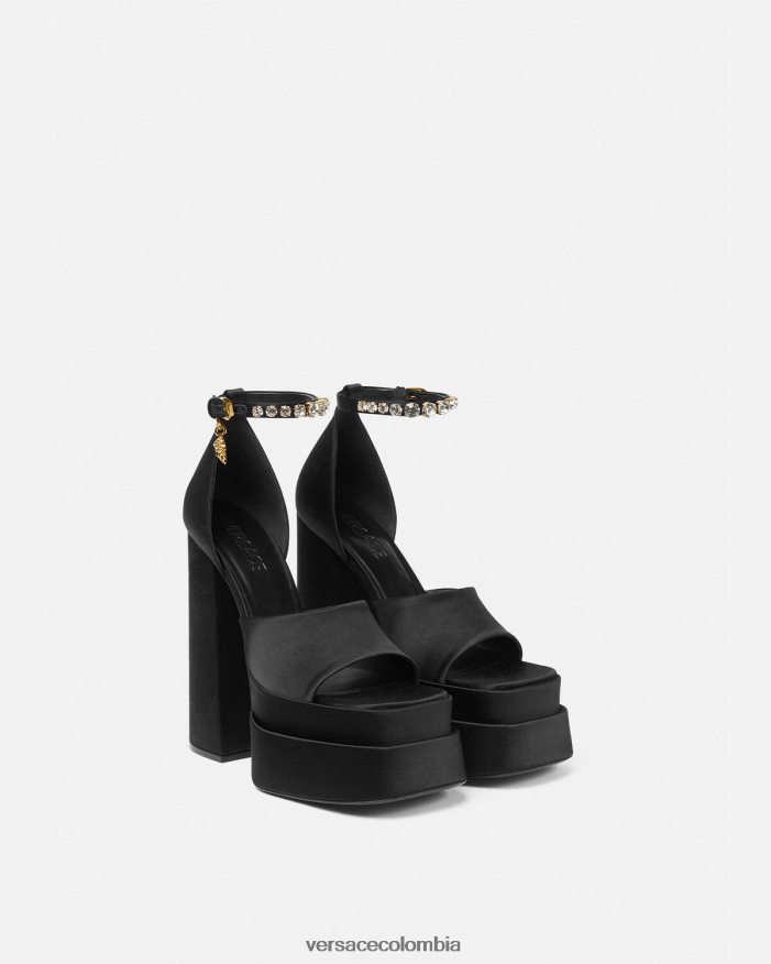 Un diseño muy versace, estas sandalias de satén cuentan con una puntera cuadrada abierta con un tacón alto en bloque y una plataforma doble. la correa del tobillo está adornada con cristales y un dije de medusa característico.