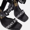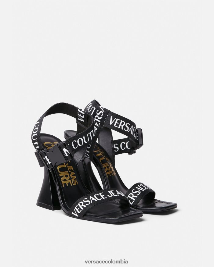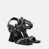 Estas sandalias de tacón alto tienen tacón en bloque y tiras de tela con cierre de hebilla y logo estampado.