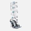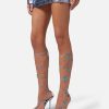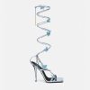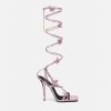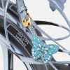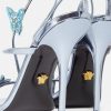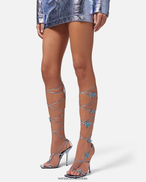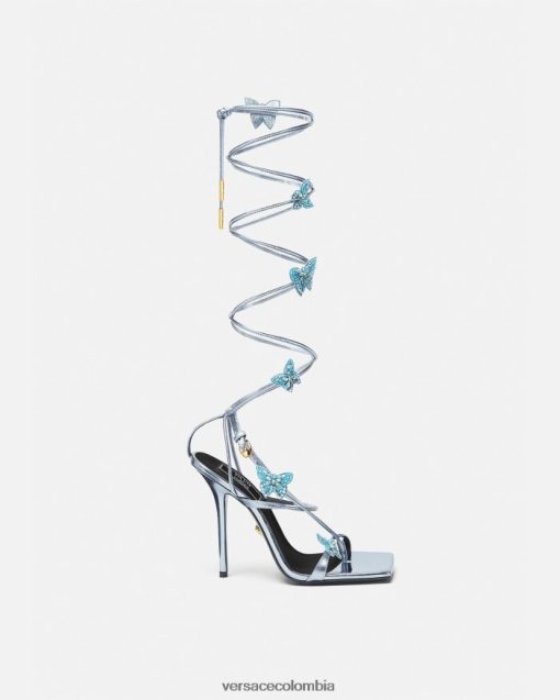 versace presenta dua lipa x versace, una colección cápsula codiseñada con dua lipa. Estas sandalias de tacón alto con cordones están detalladas con mariposas adornadas con cuentas y cristales en todas partes. El diseño de tiras y punta cuadrada está confeccionado en cuero metalizado.
